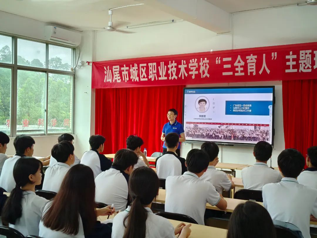 廣東省五一勞動獎?wù)芦@得者、汕尾市三八紅旗手、汕尾市國泰食品有限公司總經(jīng)理助理李群芳以《幸福是奮斗出來的》為題,從“新汕尾人 基層勞動者”“因海而生 向海而興”“助農(nóng)收購農(nóng)產(chǎn)業(yè) 共促鄉(xiāng)村振興”幾方面聲情并茂地講述自己愛崗敬業(yè)、拼搏奉獻的感人故事,鼓勵大家要堅定理想信念、勇?lián)鷷r代使命,并將一顆勞動光榮、技能寶貴、創(chuàng)造偉大的種子播撒在青年學(xué)子的心田。