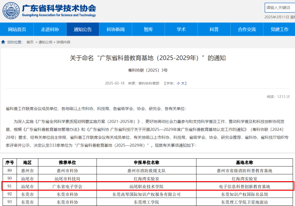 近日,廣東省科學技術協會與廣東省科學技術廳聯合發布 “廣東省科普教育基地(2025—2029 年)” 認定名單,汕尾職業技術學院海洋學院申報的電子信息科普創新教育基地成功獲批,這也是學校首個省級科普教育基地。
