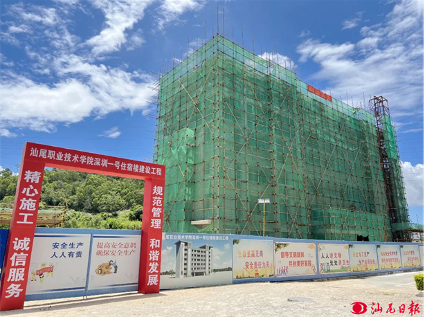 汕尾日?qǐng)?bào)訊? (記者 陳曉銘 通訊員 林俊衍)近日,汕尾職業(yè)技術(shù)學(xué)院“深圳一號(hào)住宿樓”主體工程完成封頂。