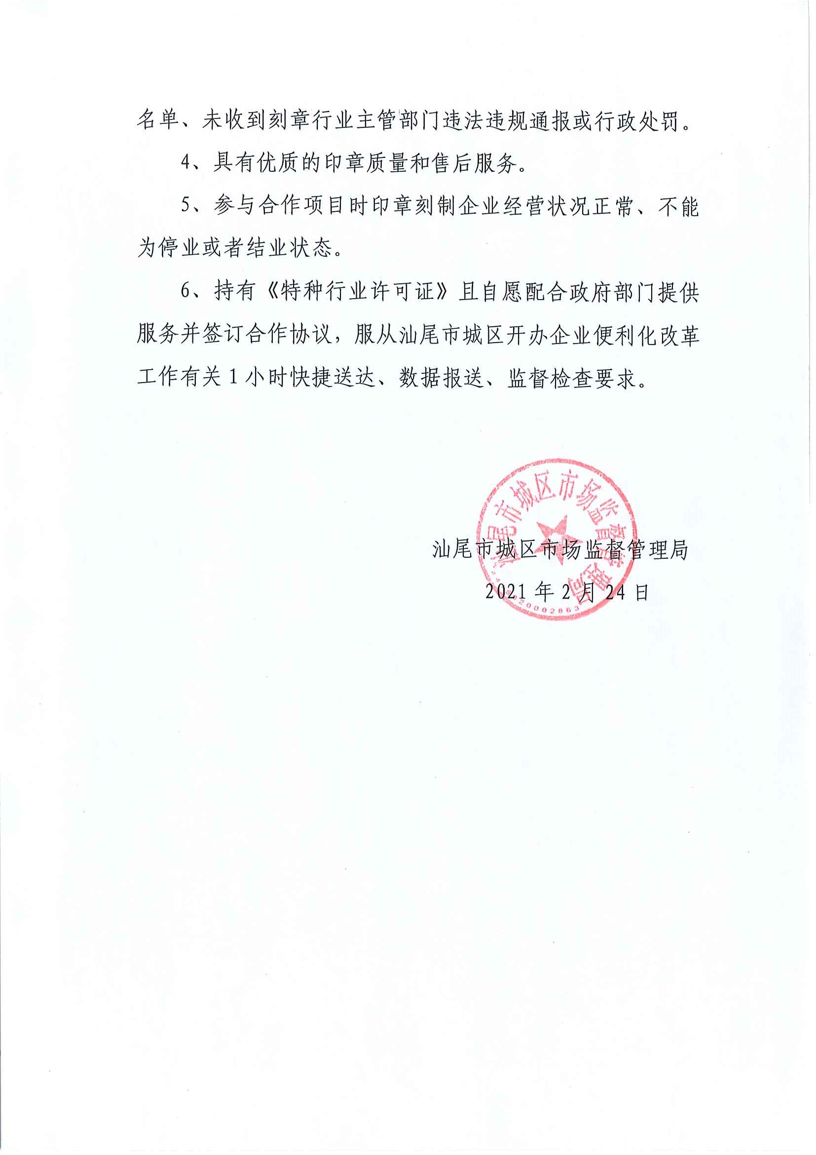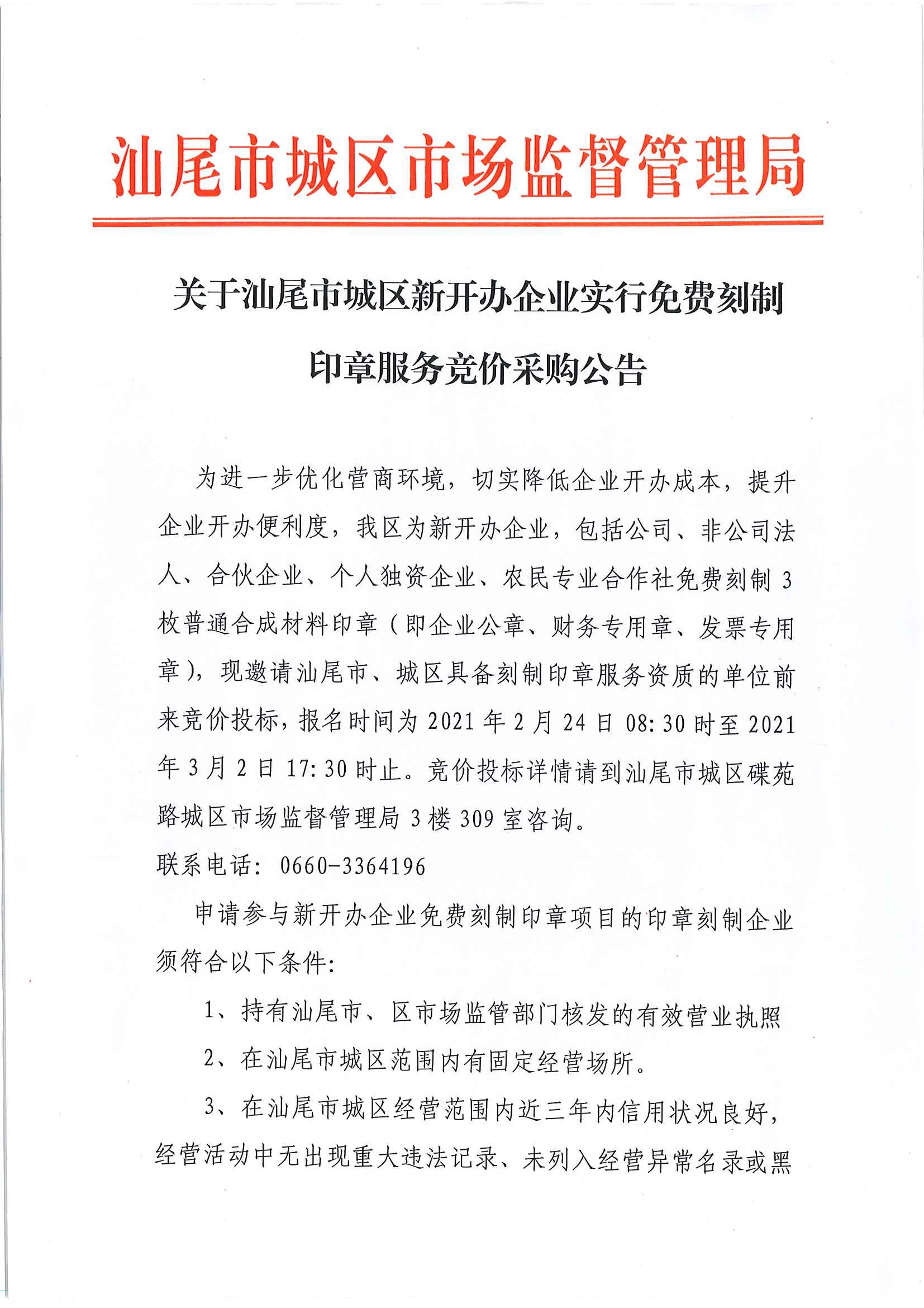 關于汕尾市城區新開辦企業實行免費刻制印章服務競價采購公告