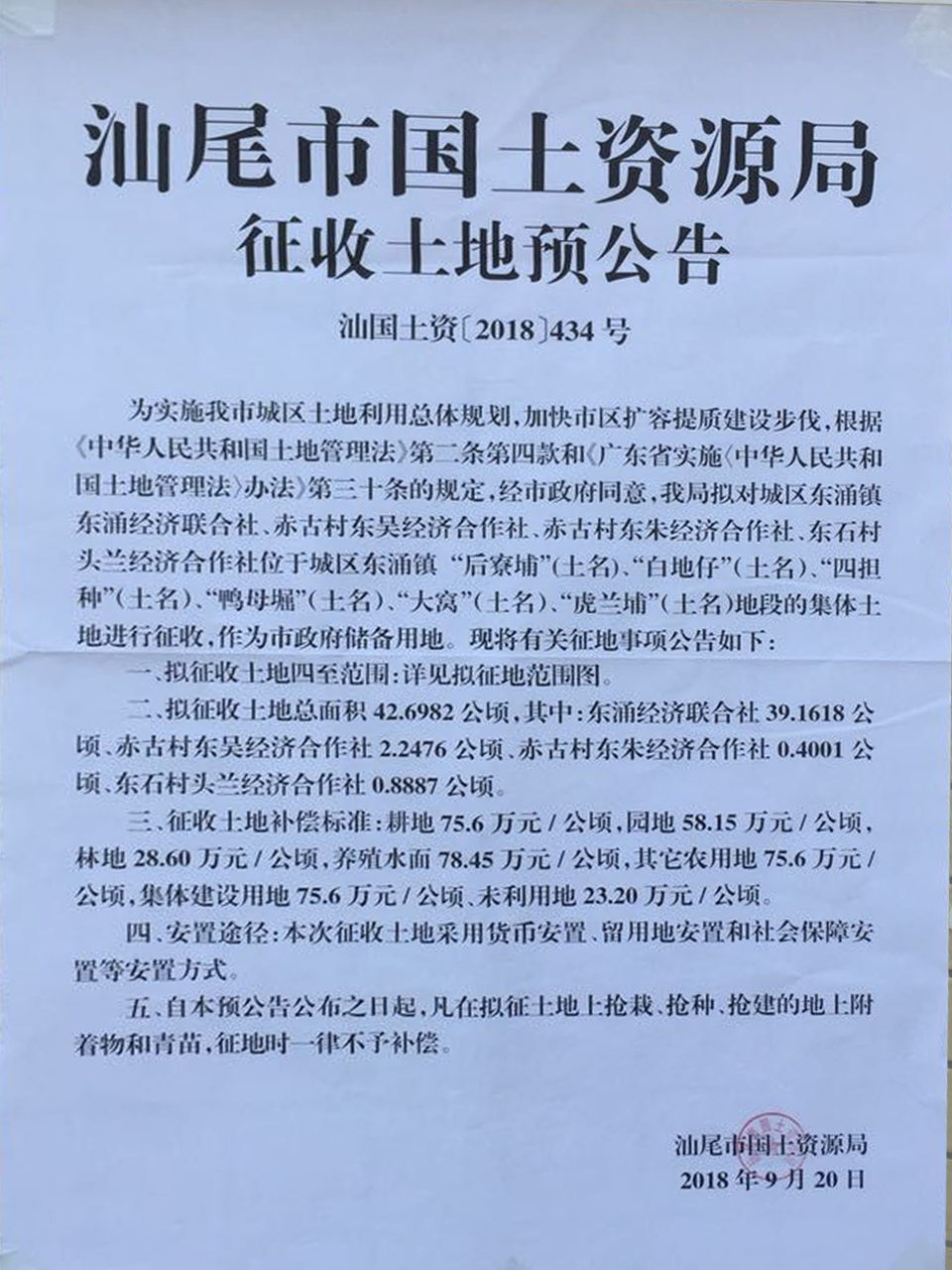 汕尾市國(guó)土資源局征收土地預(yù)公告[汕國(guó)土資〔2018〕434號(hào)]